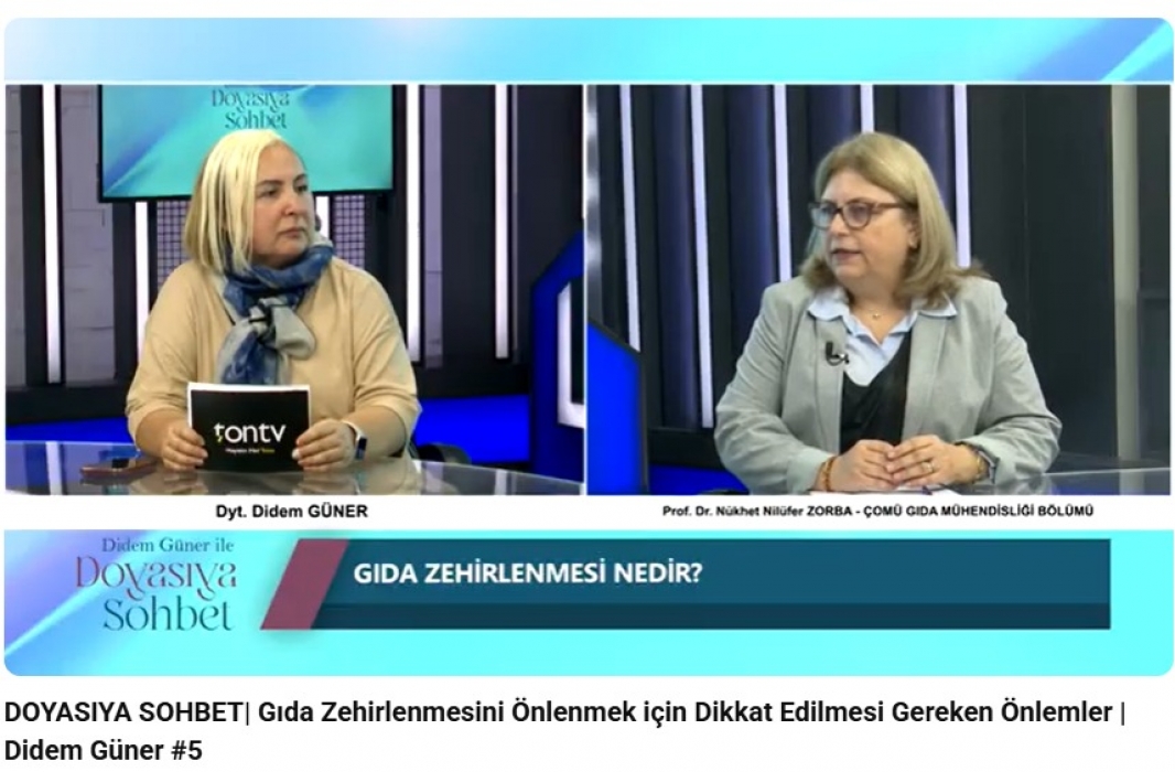 Bölüm Başkanımız Prof. Dr. Nükhet Nilüfer ZORBA, Ton TV’de Didem Güner’in sunduğu Doyasıya Sohbet programına konuk olmuştur. Programda, gıda zehirlenmesini önlemek için dikkat edilmesi gereken önlemler hakkında önemli bilgiler paylaşmıştır.